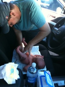 When dad returned with food, we were a mess – and we had 4 minutes to spare. That’s when we realized we had nothing cooler to dress our child in (poor diaper bag prep) and were going to have to rapid-fire change her in the front seat (see above), then squeeze her back into the car seat, squeeze THAT into the stroller frame, and rush to be on time.