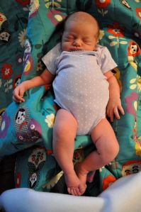 On Sunday, we had a CIMI come over and teach us Infant Massage, which is supposed to be a great way to help babies digest better, sleep better and bond better – plus, it’s fun! And there are benefits for parents, too – one of the biggest (in my opinion) is that when you watch your baby grunting and squirming and squeaking to get rid of gas or poop (which happens often), you can actually help. Or at least try to help… Some poops have a mind of their own ;) And let me tell you, little Zoe is not afraid to EAT! In fact, she’s over 8 lbs now (woo hoo!), at just 4 weeks of life, so we get plenty of opportunities to change diapers (Food In, Food Out) and test out our new massage techniques.