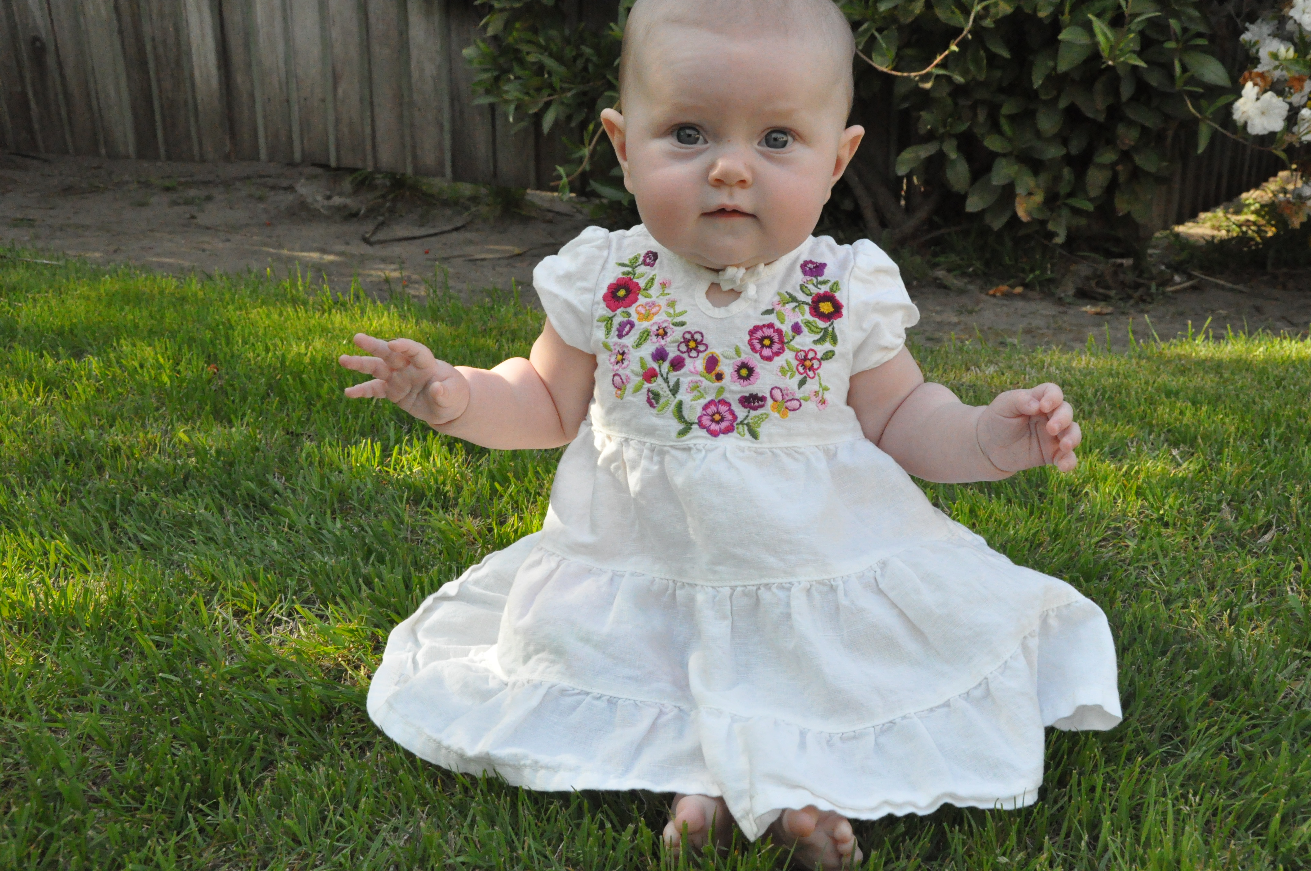 So back to dresses. It’s not that they aren’t cute, Bardo, it’s that along with dresses you either need tights or bloomers or at a minimum socks, which as I mentioned are tough to keep on a child who can’t stop moving her feet. And tights are cumbersome, bloomers have to come OFF to change a diaper. Do I sound like a crazy (lazy?) person…? Maybe when she’s walking I’ll feel differently about dresses – who knows?