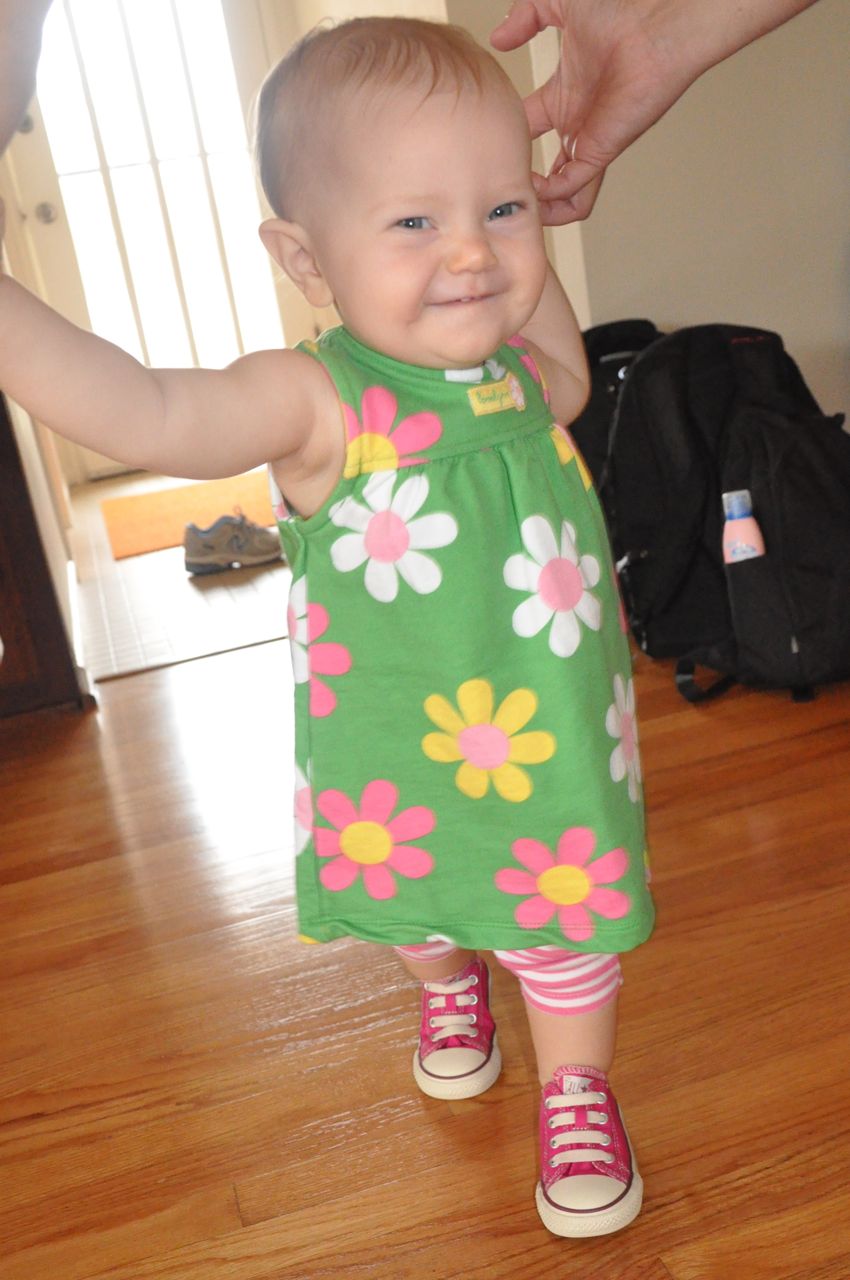 Up next: SHOES! Our friend Sarah got her the pink chucks in the photo above, but other than me just putting them on her for fun (she loves to say shoes shoes shoes), we haven’t had a need for shoes. Now, the world of shoes has opened up. We’re waiting a few weeks to tell my mother the great news, because once she has official permission to buy shoes, there will be no stopping her (just kidding, mom!).