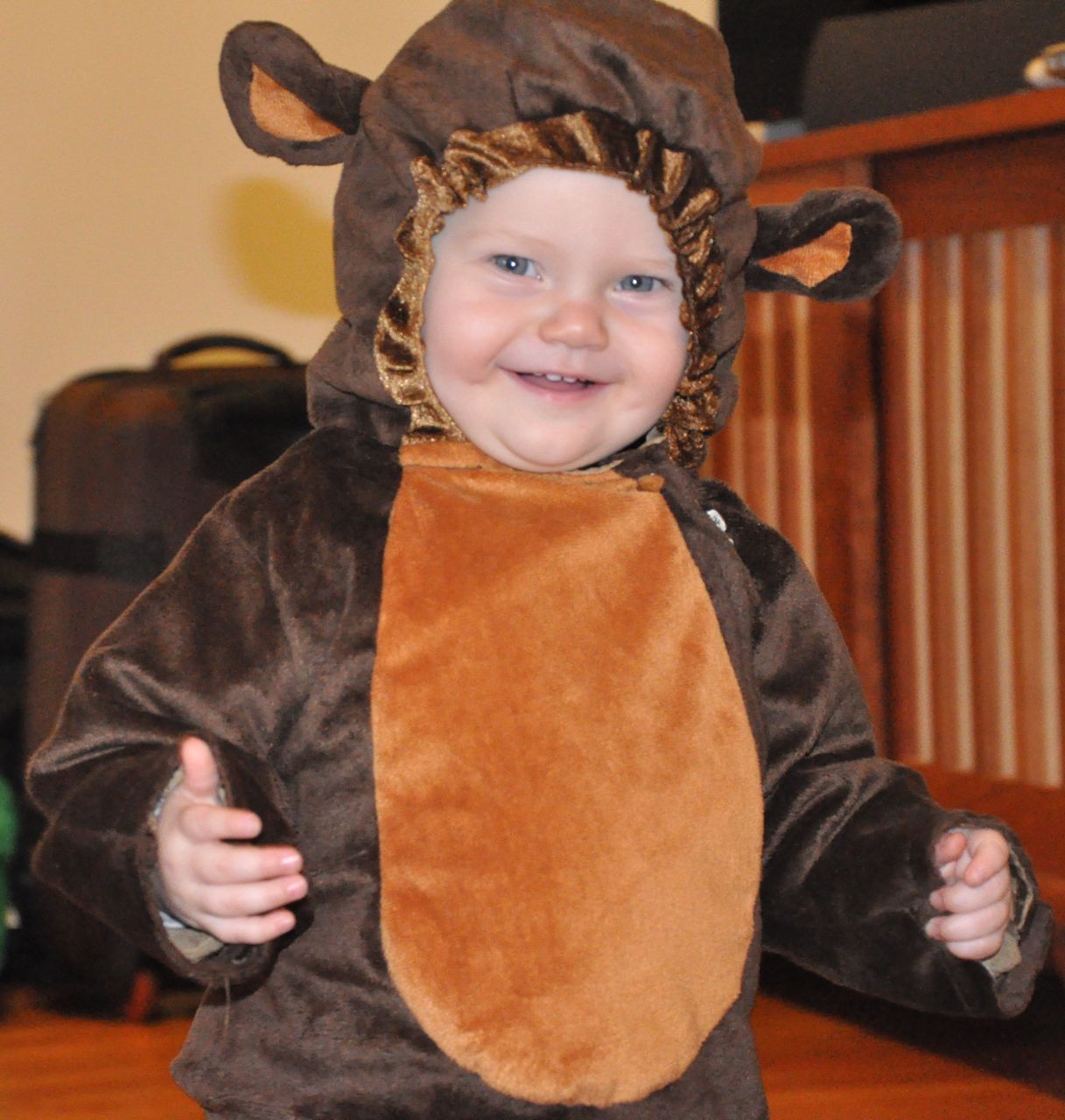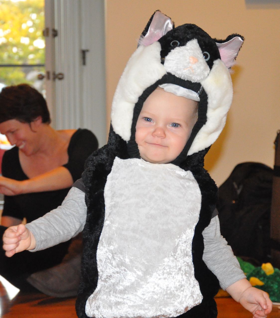 After each costume change, we frantically snapped blurry pictures of our little walker (she’s pretty fast already…) and laughed our heads off. Which made her laugh. Which made us laugh more. And so on. Leave it to Bart to finally say – when we got the last costume on her no less – “hey, let’s show her a mirror”. Oopsy? Who’d have thought she’d want to SEE herself with a dragon on her head. That wandering around for our enjoyment in a kitty outfit saying “meow” wasn’t everything a small child could hope for?! Regardless, we had a blast.
