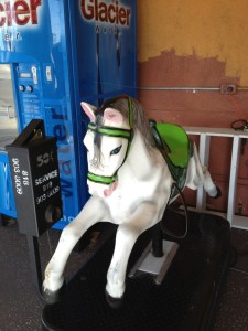 For many, many, many months, our Friday nanny Blanca has been taking Zoe to this very horse to “ride the horsey”. She loves it. One might say, she’s obsessed with it. Now that she’s old enough to make some strong associations, not a Friday passes that she doesn’t talk Blanca into taking her there. And at 50 cents a ride, I’m pretty sure at some point this little horsey might just break the bank.