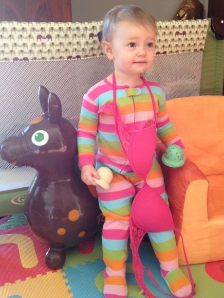 Don’t ask me how she keeps finding my bras – let’s just say, she does. And every time she does, she attempts to put one on. She may not get the idea yet, but she’s in the general vicinity. And I fight my instincts to find other funny ways for her to wear it.
