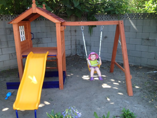 Oh, the things you do for love. First of all, extra super big thanks to my mother (who Zoe calls Nina) for the awesome swing set she gave Zoe as an early birthday present. Since her birthday is so close to the end of summer, Nina thought she could enjoy it most if she got it early! And she was right.