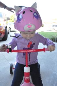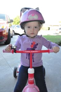 One more thing we learned: you can’t “try out” a new kitty helmet to see if it fits. Even when it doesn’t quite fit (and you have to tighten it down to make sure it does its job), your small child will want to wear it, around the house, during breakfast and so on. Maybe better to try those on in the store… So many lessons to learn! Vroom, vroom.