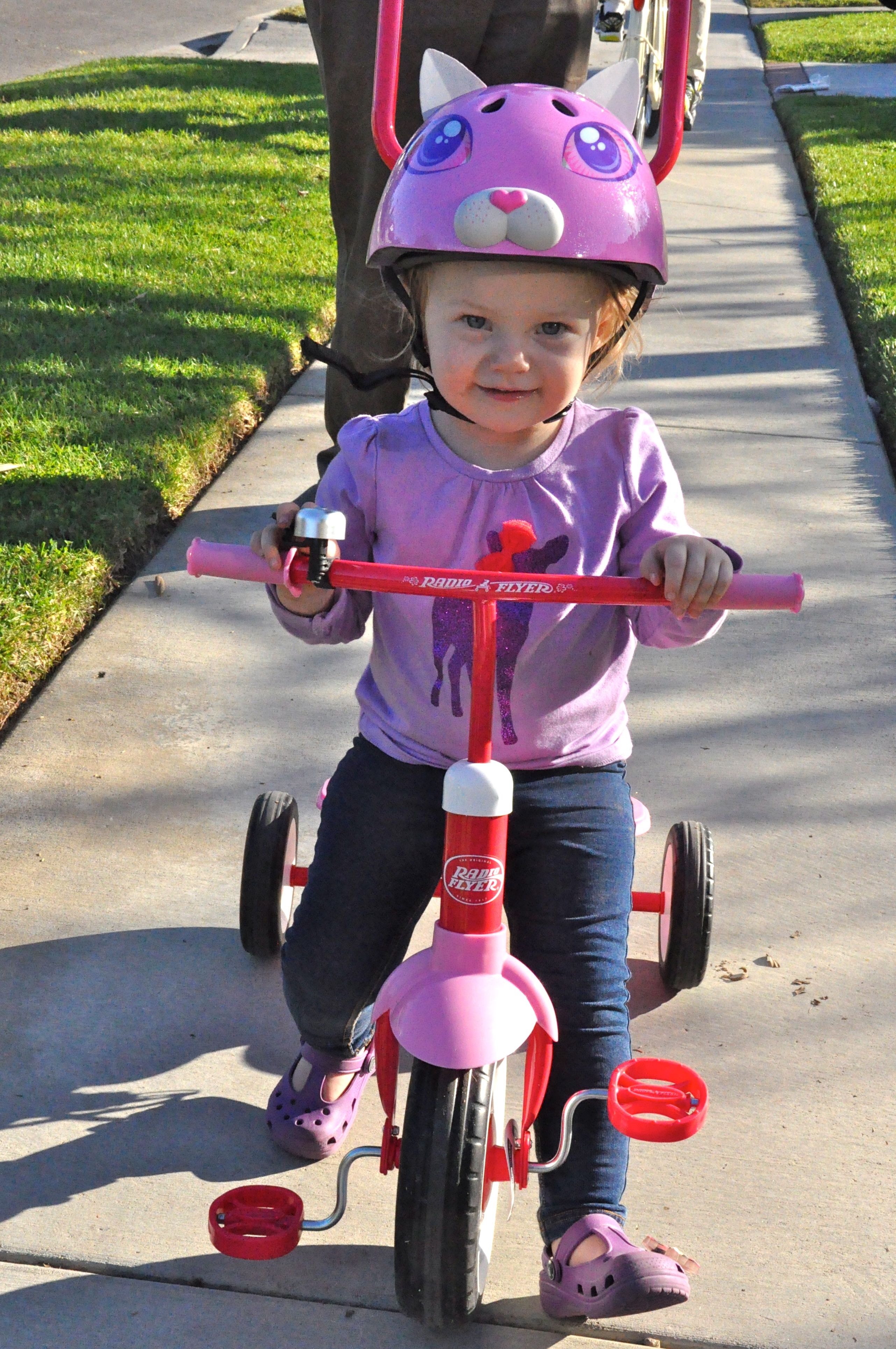 Anyway, so far she prefers to “push” along with her feet (as she should have done with the balance bike but never wanted to do) and is resisting the pedaling part. Oh, and she really likes to “coast” (read: we push the trike while she puts her feet up on the pedals). But in fairness, she hasn’t had much time to figure it out yet, and at least she likes to stay ON this one. We’ll see how it goes!
