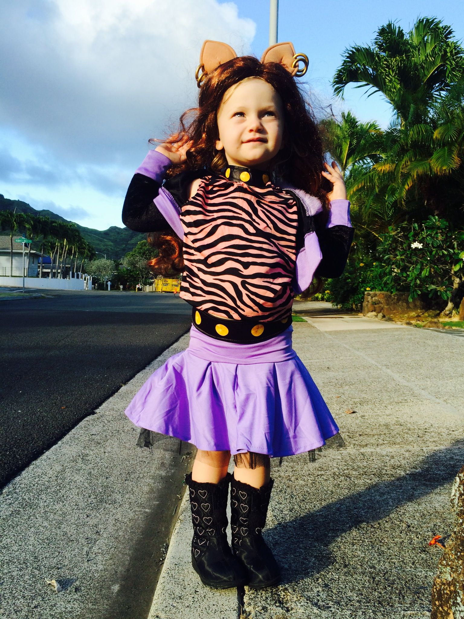- Halloween! Zoe’s first trick or treating EVER happened in a shopping center in Hawaii in broad daylight where all the shops gave out candy (and pencils?) and all the kids got to see one another’s costumes, which was a real bonus. Oh, and our whole family dressed up as “The Spectaculars” with homemade costumes provided (and created!) by my sister and my niece. It was a memorable wedding anniversary – oh, and my mother is a TROOPER! As a followup to THIS POST, I got my picture of Clawdeen in her wig, followed by “I want to be a superhero (Spectacular)”, but hey, a picture’s worth 1,000 whines.