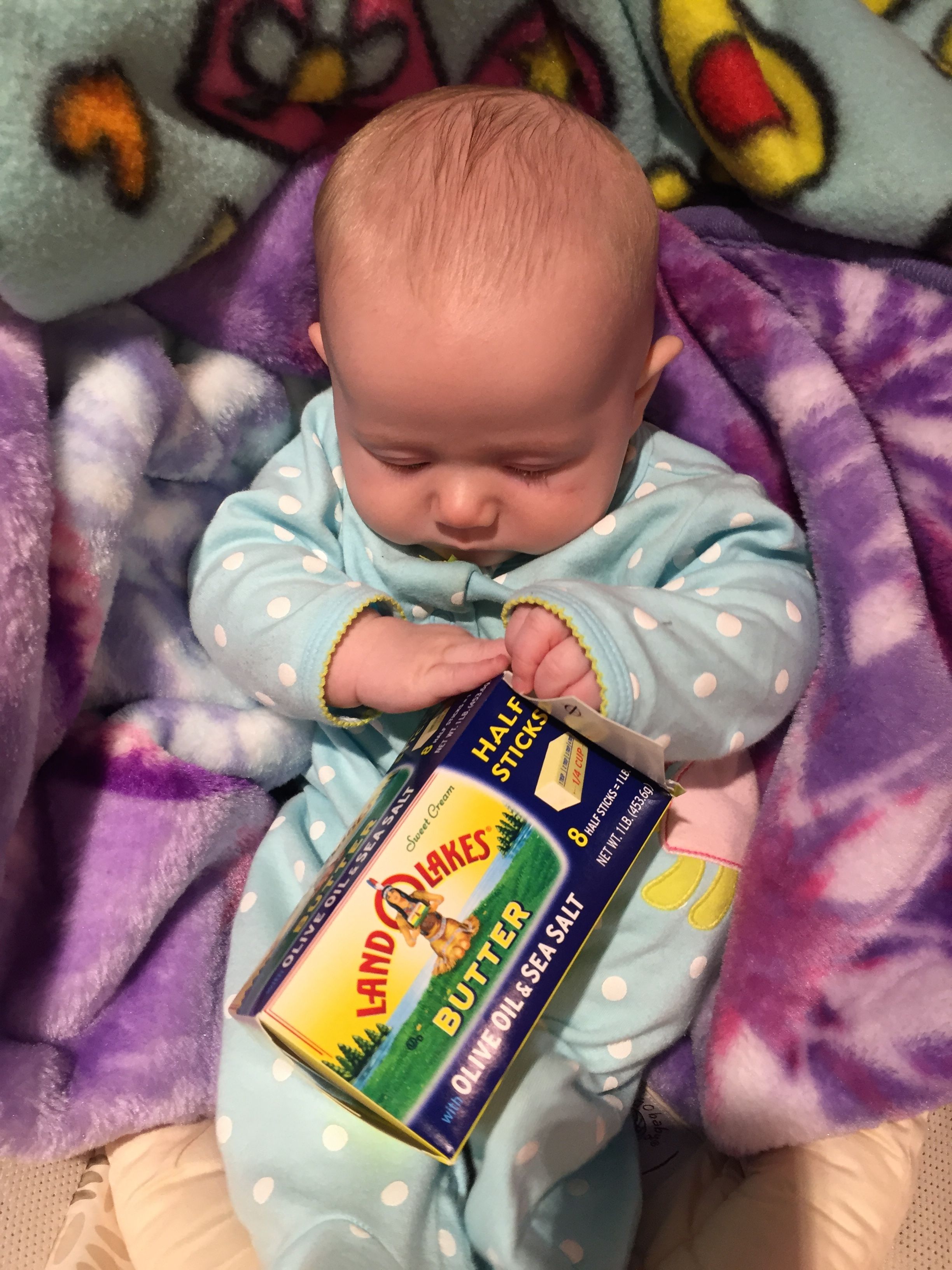 As you know, we can’t seem to stop comparing our two beautiful little girls, which means we’re constantly walking down our Zoe memory lane, with little Ella as a reluctant participant. Which is how we ended up with this picture of Ella with an EMPTY box of butter: