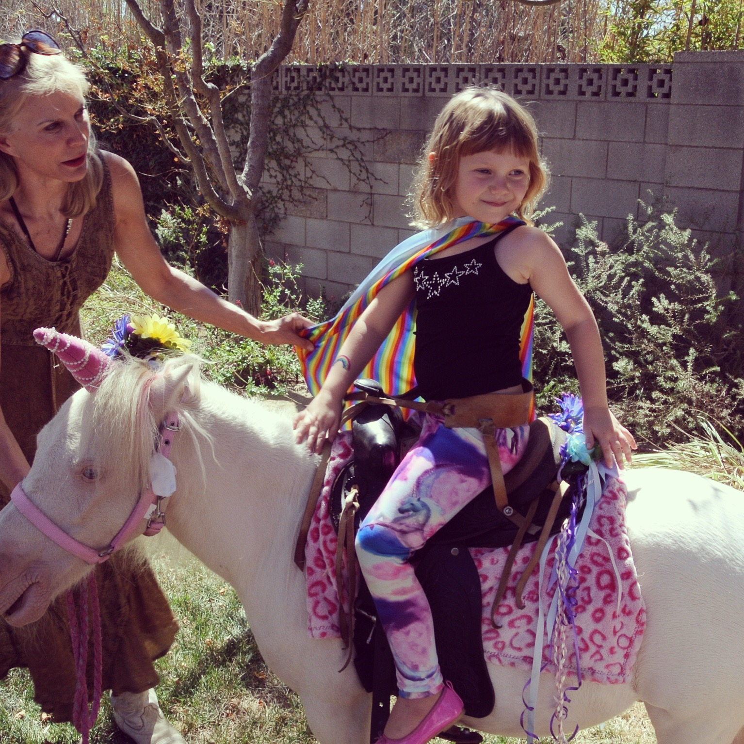 There was a local resource called Happiness Unlimited (how can you go wrong with that?) that not only brought ponies to your house but ponies with a UNICORN HORN. They also offered a “pony painting” party, but I don’t care how “safe” the paint is, I just couldn’t be the parent who taught small children it’s OK to paint a live animal… What sealed the deal? I said to my husband, “Honey, can you IMAGINE Zoe’s face when a unicorn shows up at her house?” Done.