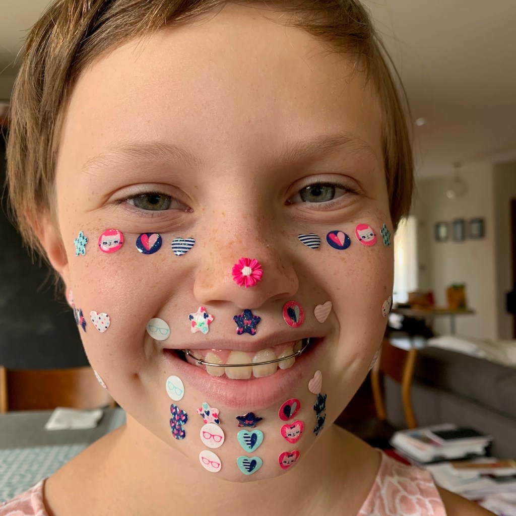 The things little girls do when they’re bored. Those are stick-on earrings that Ella got tired of using, so she put them all over Zoe’s face.