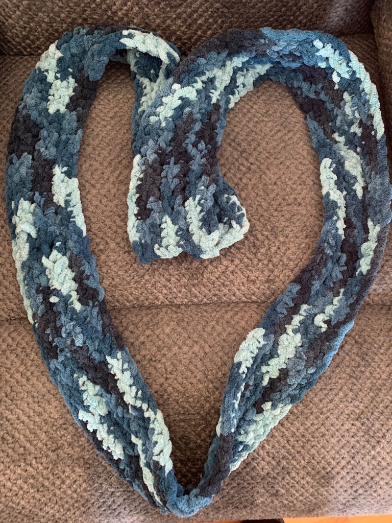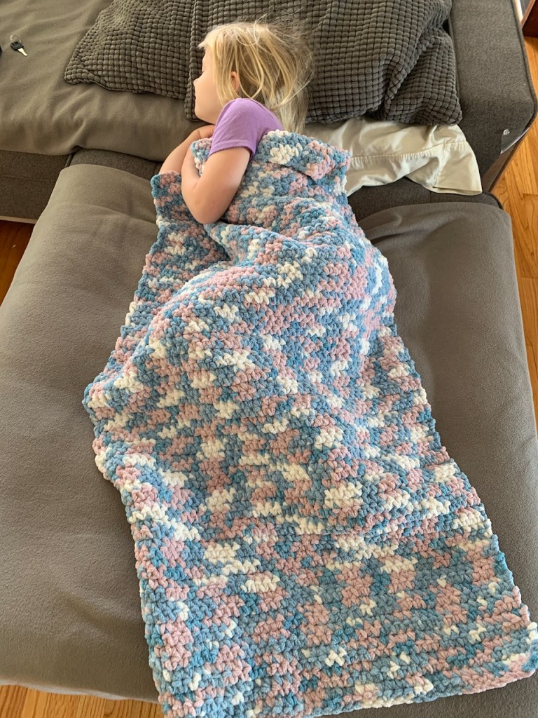She was so impressed with herself that she crocheted another one for her friend’s birthday. And it turns out that I am out of control… My friend Kim introduced me to the Bernat blanket yarn you see above, which is thick and soft and so easy to work with that I have now crocheted 9 scarves and even a small blanket for Ella, which she sleeps with every night.