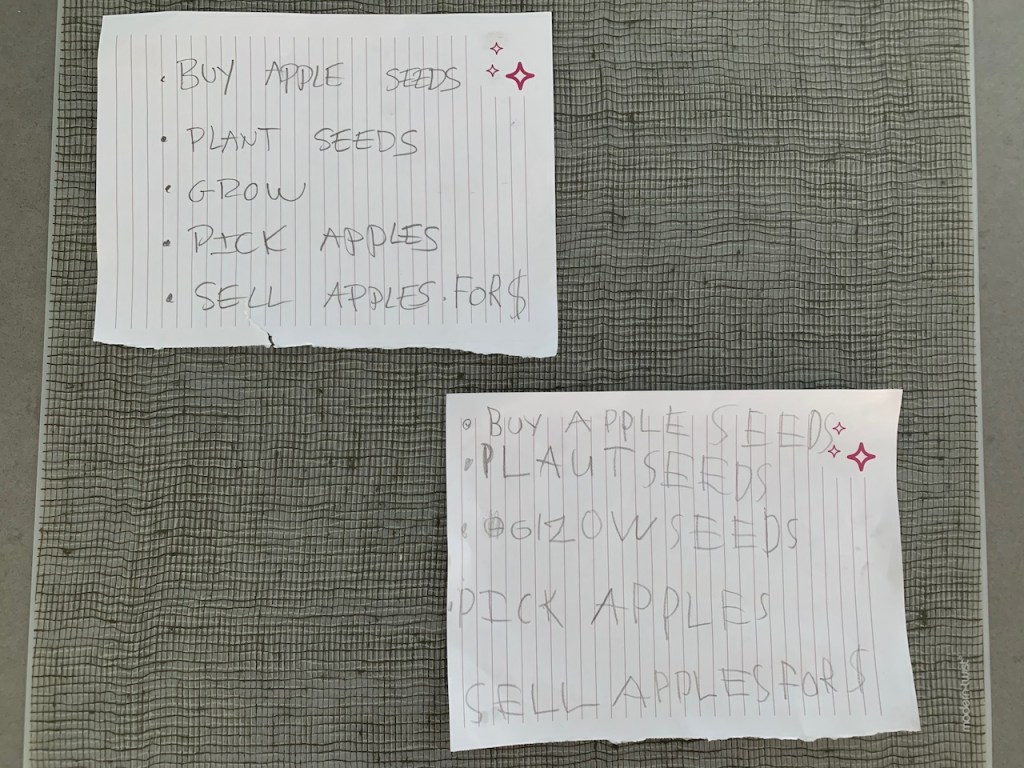As a bonus, Ella created a get-rich-quick scheme (well, not that quick, but still, rich). Apparently they were talking about the lifecycle of apples in her class at school. With Bart’s help (he provided the spelling only), she created a business plan. The top-left page was written by my husband. Guess who shouldn’t be teaching letters to children? My husband.
