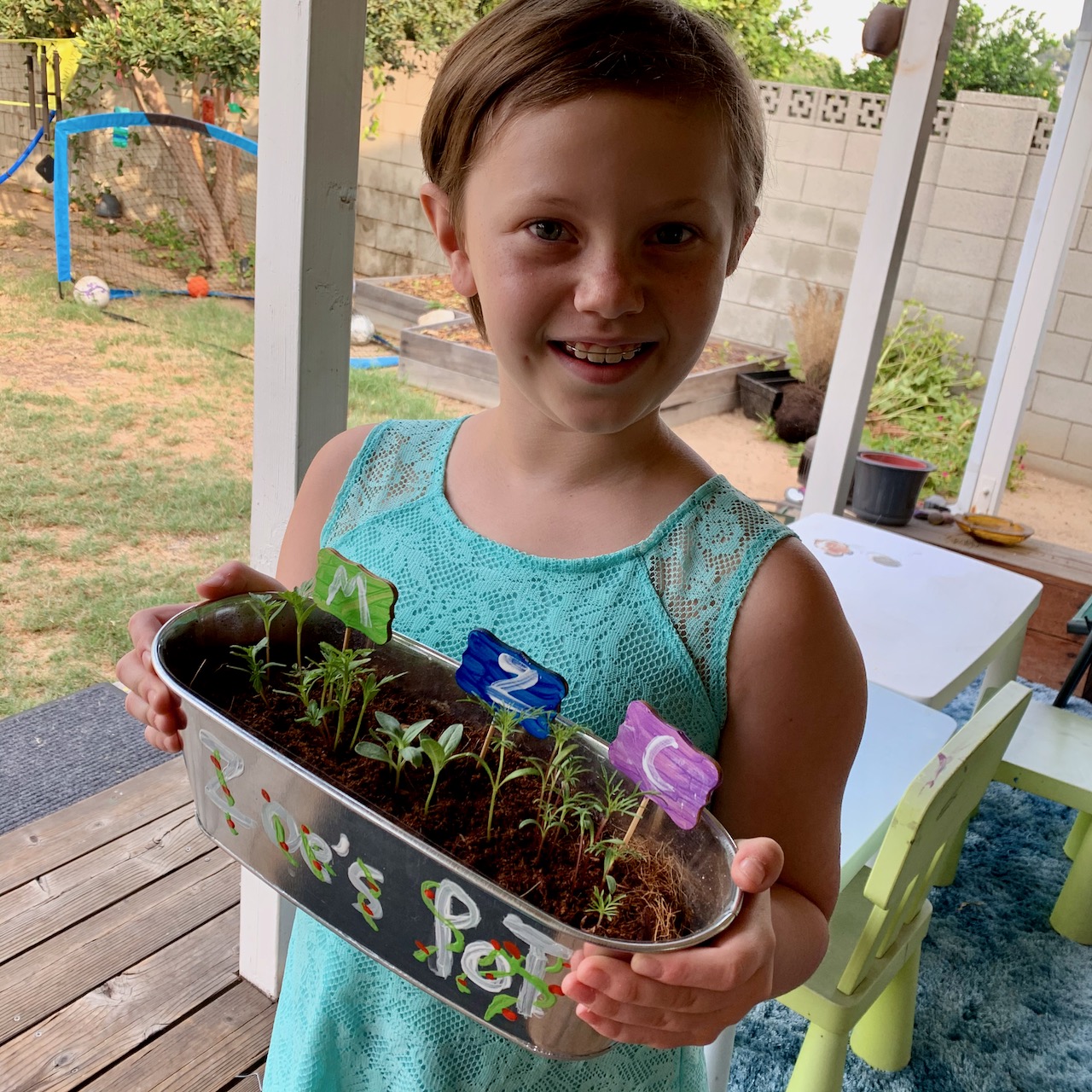 Our sweet cousin Cathy sent Zoe a garden kit for her birthday, which included that cute metal pot and all you need to create (and decorate) your own personal garden. SO CUTE! Zoe was thrilled when her seeds magically started turning into (gulp) PLANTS! I can’t wait to see them bloom.