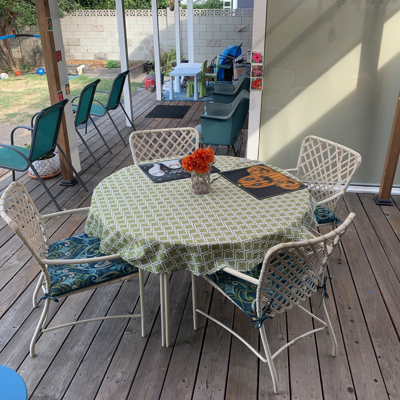 I also realized we haven’t spent as much time on our deck lately because of the heat (it’s been 92-102 for the past forever weeks, it seems). Still, the girls have eaten lunch outside at an IKEA kids’ table every single day, as they would have at school. Now that my sweet husband has gifted me the back room for work, my view overlooks a different table. So I decided it would be awesome to put the girls there, complete with Halloween placemats and some cool orange flowers (thanks, Shawn)!