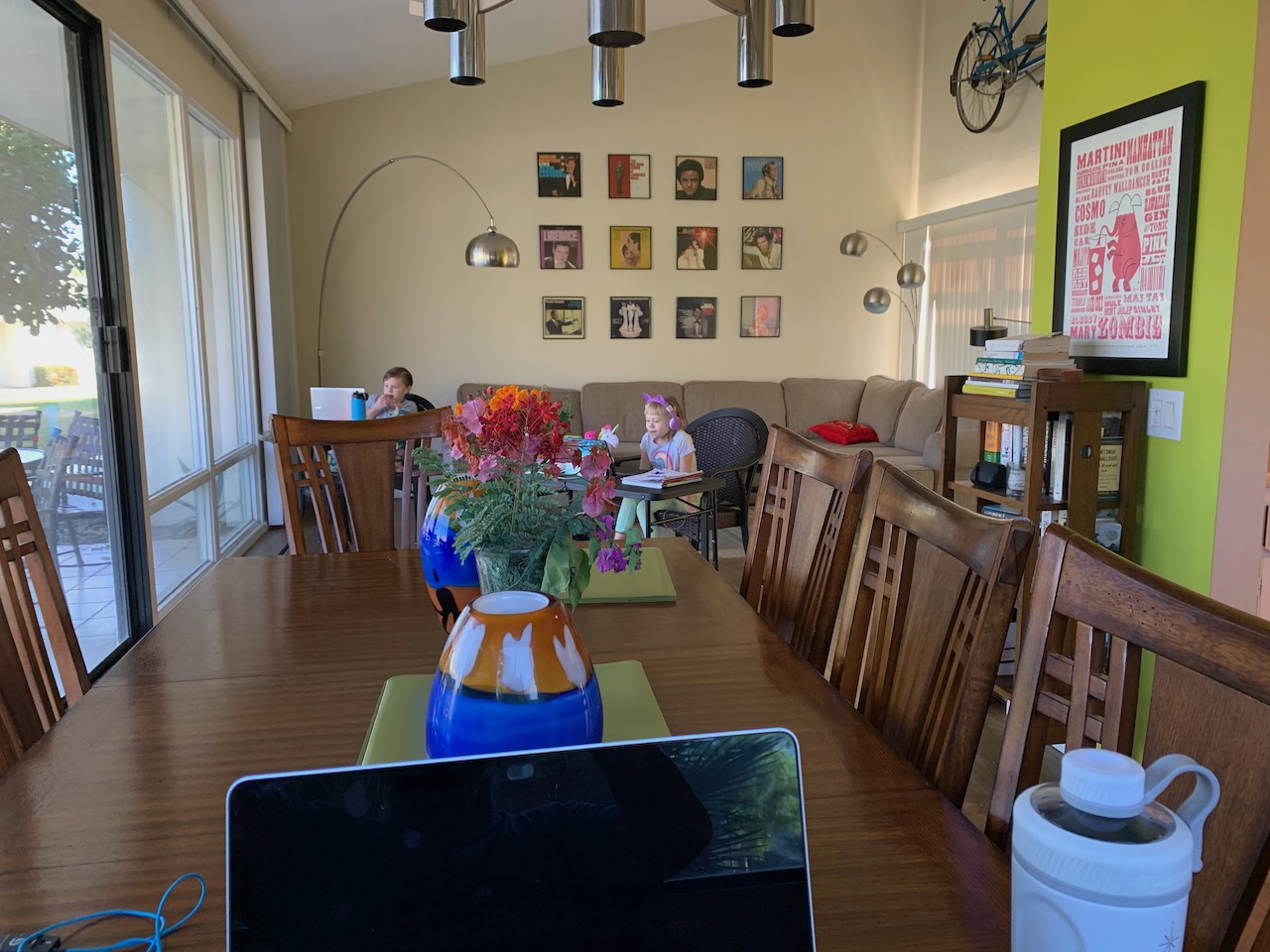 Maybe she’s clairvoyant. The school + work arrangement worked well for them, too, with a place for everyone in the main room, where Bart could keep an eye on the girls (and Zoe could keep an eye on Ella’s screen):