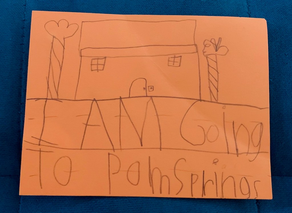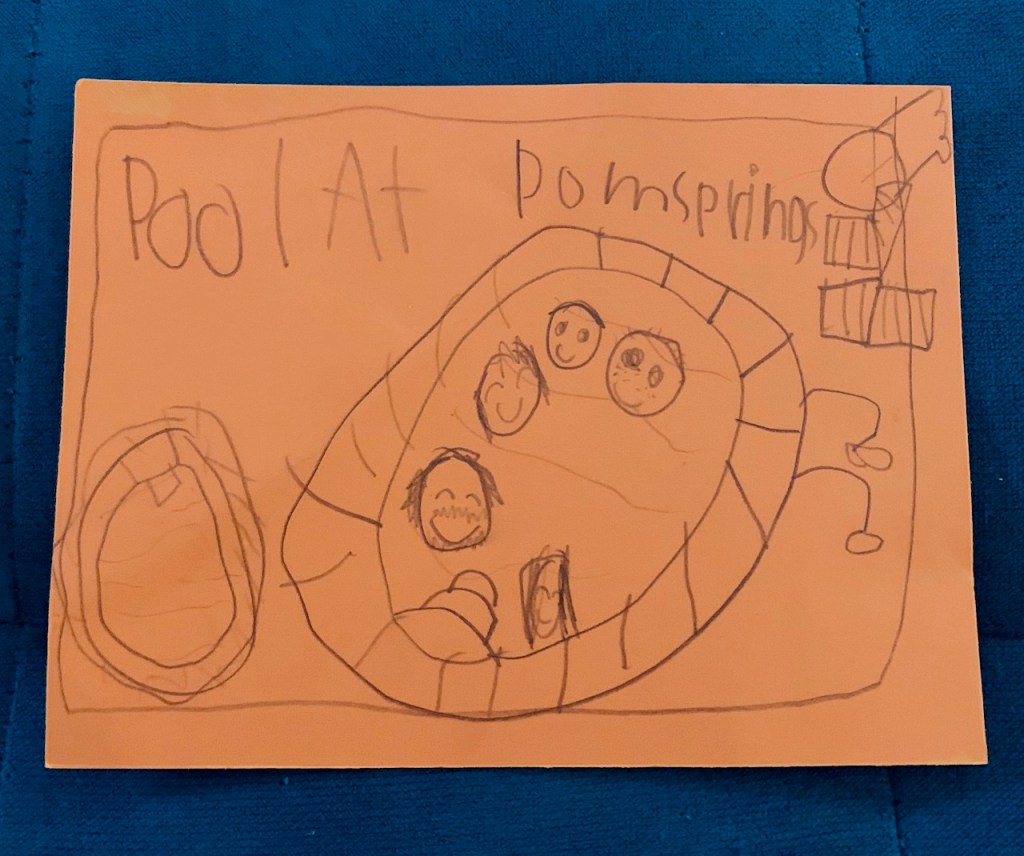 Ella was so excited about the trip that she wouldn’t stop telling anyone who would listen. Plus, she made the sign above, which was two-sided, and here’s the back (yes, it clearly says “POM Springs”):