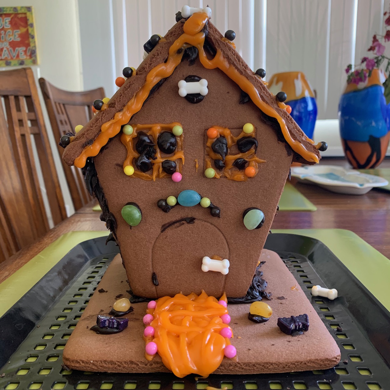 We had a lovely family weekend. The girls constructed a haunted gingerbread house (thanks, TJs):