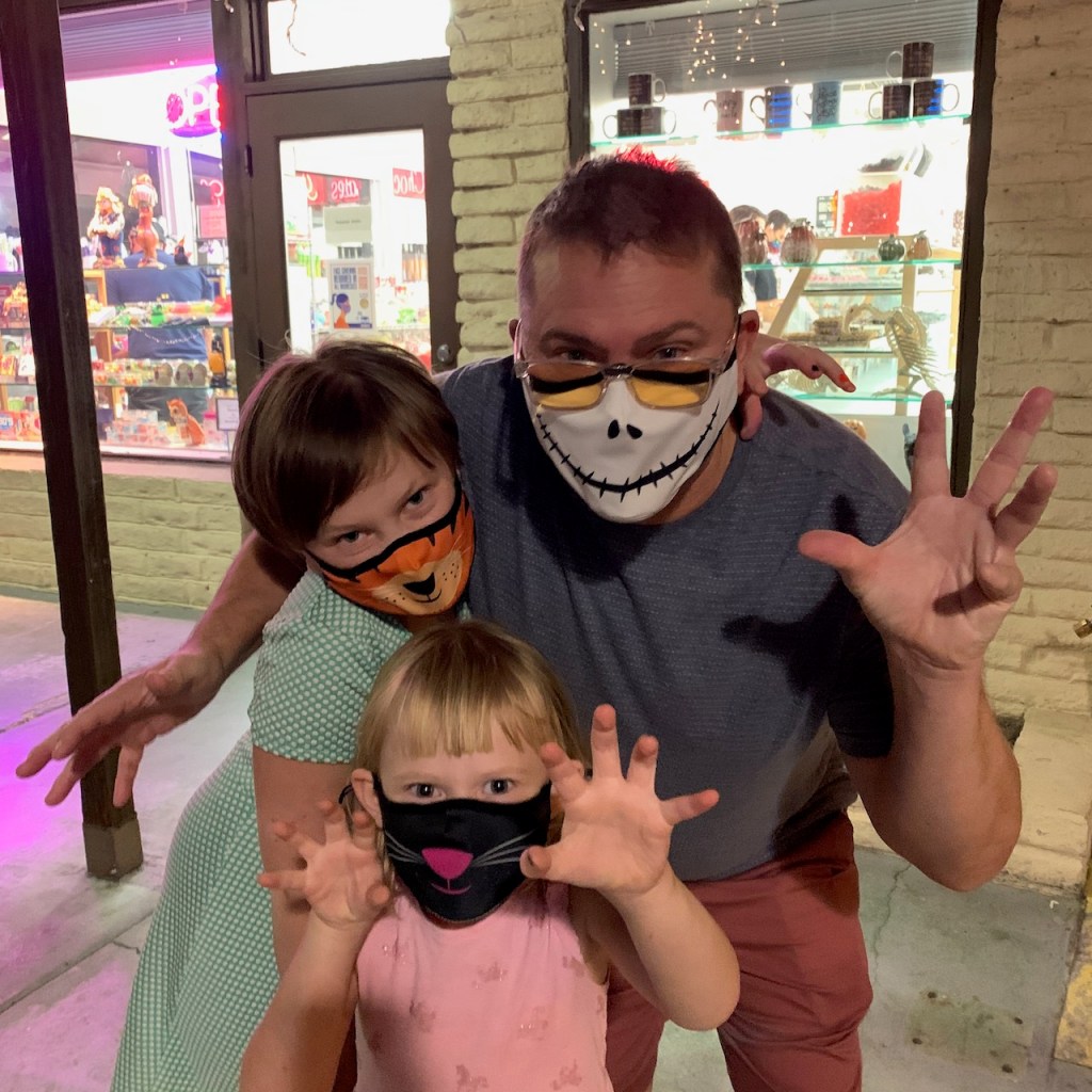 The last bit of weekend family fun we had was an outdoor mexican dinner in downtown Palm Springs, where I unveiled our new Halloween masks (the protective, not costume-related kind):