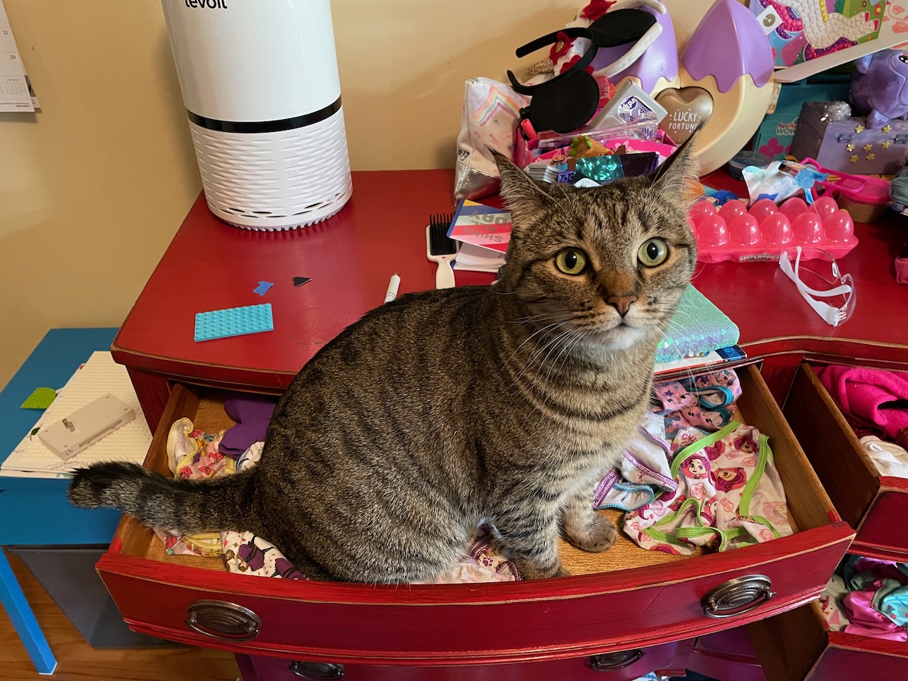 Yes, that’s underwear. And yes, that’s the top of Ella’s dresser, which is incessantly covered with a zillion items of all shapes and sizes. She is a slob. Or maybe she just really really really likes to play and really really really does not like to clean up. Right. That one.