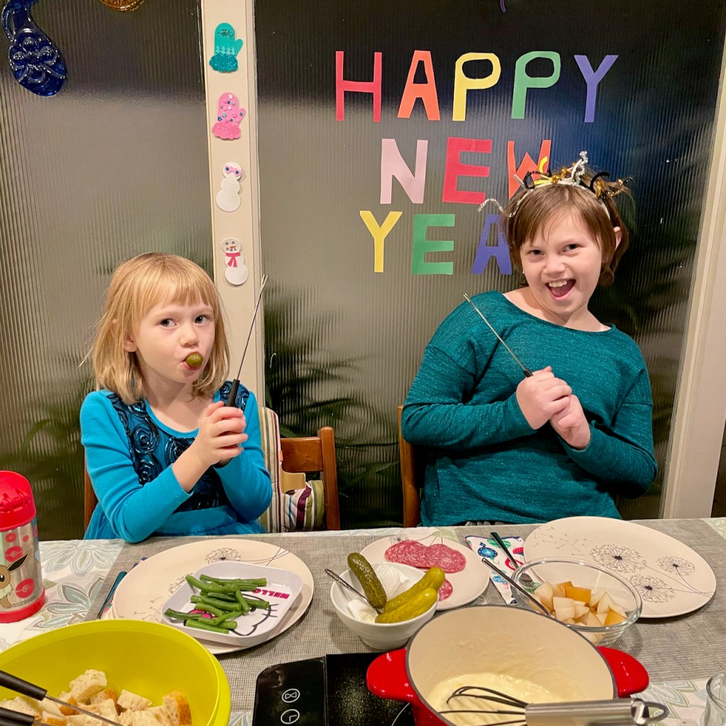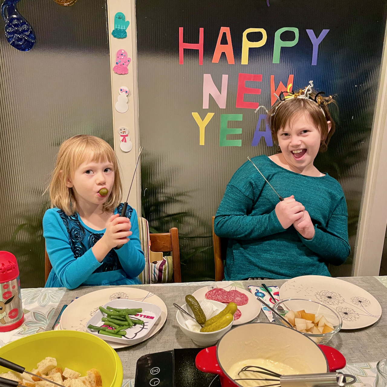 Ironically, Zoe also found a couple of “Happy New Year” necklaces we bought last year. What timing! Though we would have preferred to spend the evening with our favorite NYE friends in person, as is our tradition, we enjoyed some Zoom time with them instead. But first, we Johnsons kicked off the evening with a fancy cheese FONDUE, for which Bart had sourced 3 special cheeses and some odd liqueur to make it “authentic”. Bart and I loved it. Our children hated it, but they loved the bread chunks and accoutrements (pears, pickles, fondue forks), so I think it worked out OK.