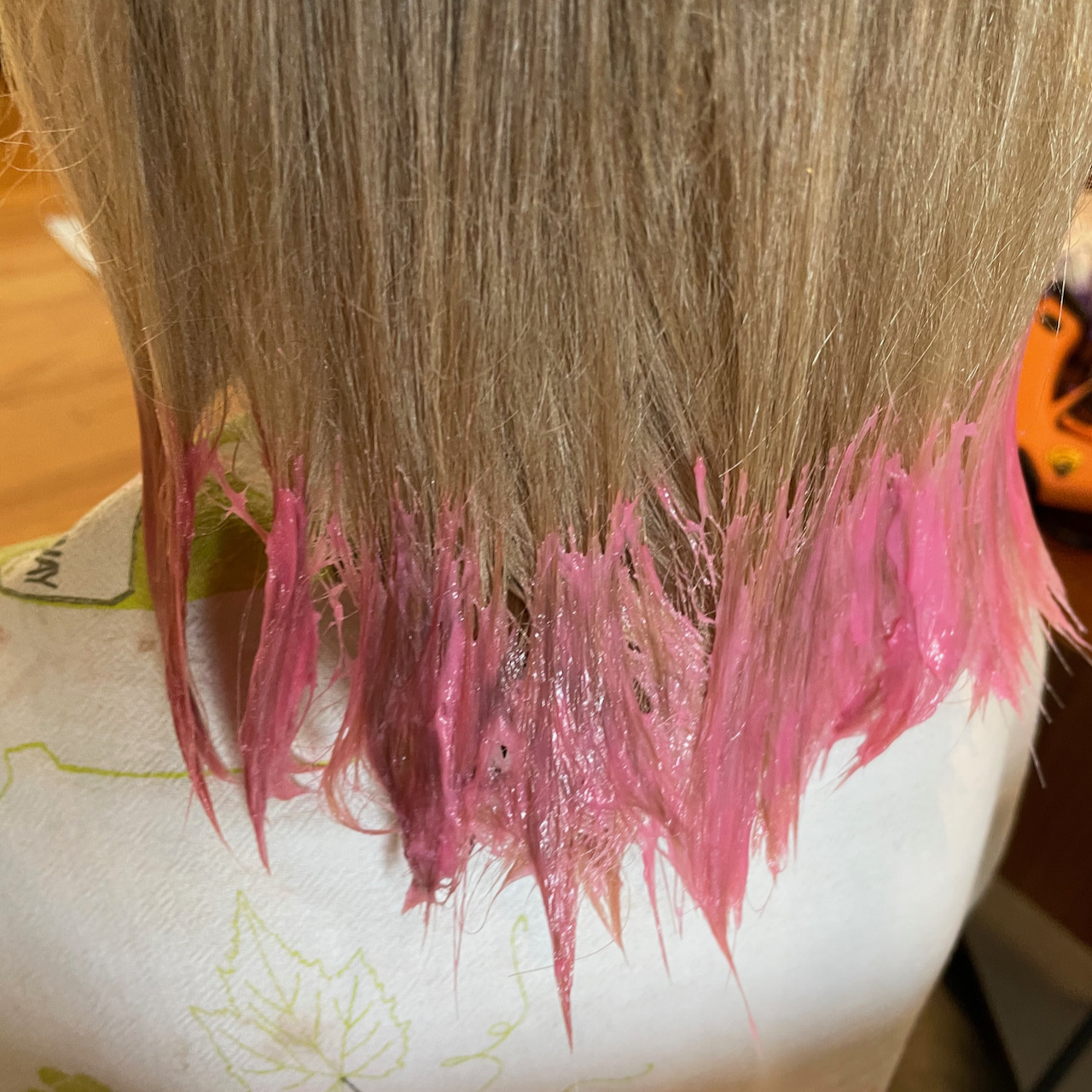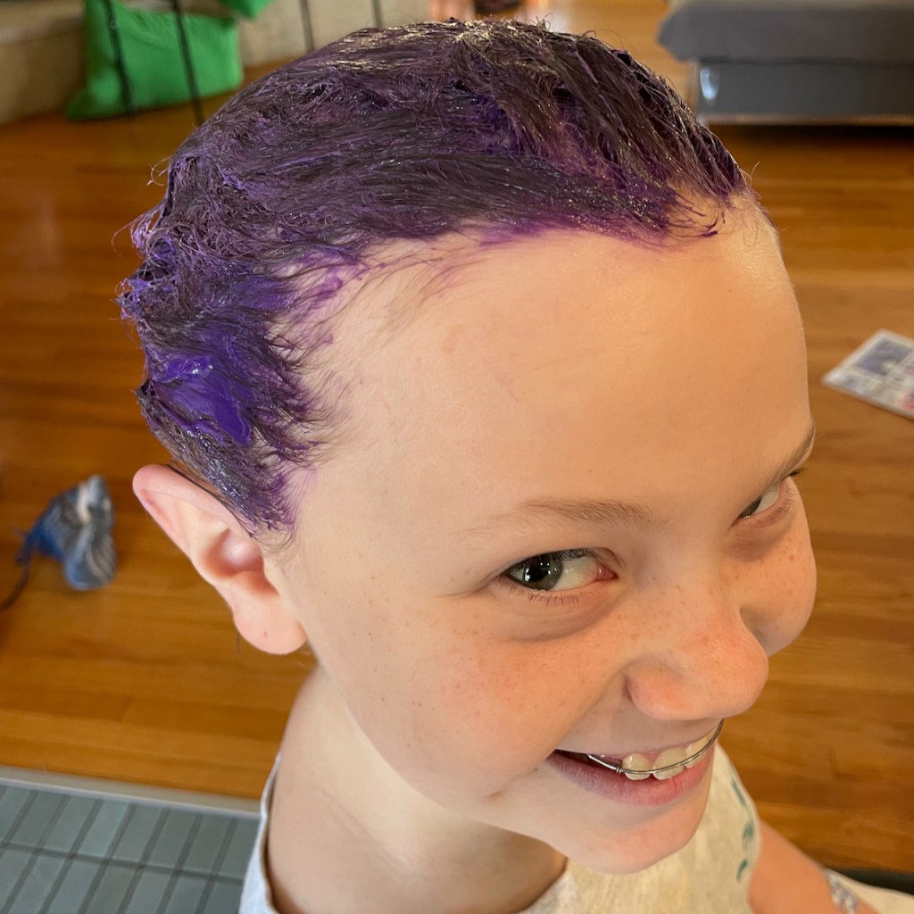 After only 15 minutes (per instructions) of leaving the product on, the super bright pink and purple you see above resulted in very muted hues. They both say they’ll consider leaving it on for longer next time, but to get them to sit still for even 15 minutes was quite the accomplishment. We’ll see.