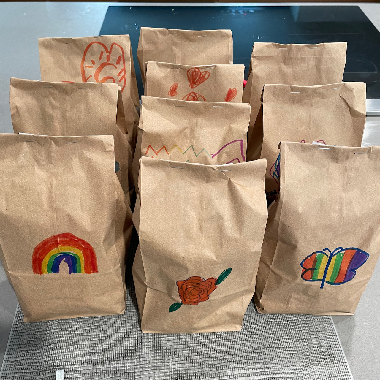 On Sunday we also started what I hope to be a new weekly tradition. One of our friends has been making lunches every week during the pandemic to donate to local groups that provide food to those in need. To participate, you make 10 lunches including a sandwich, chips/treats, a drink and napkin in simple brown paper lunch bags, labeled. They encourage bag decorations, which of course our girls were happy to do: