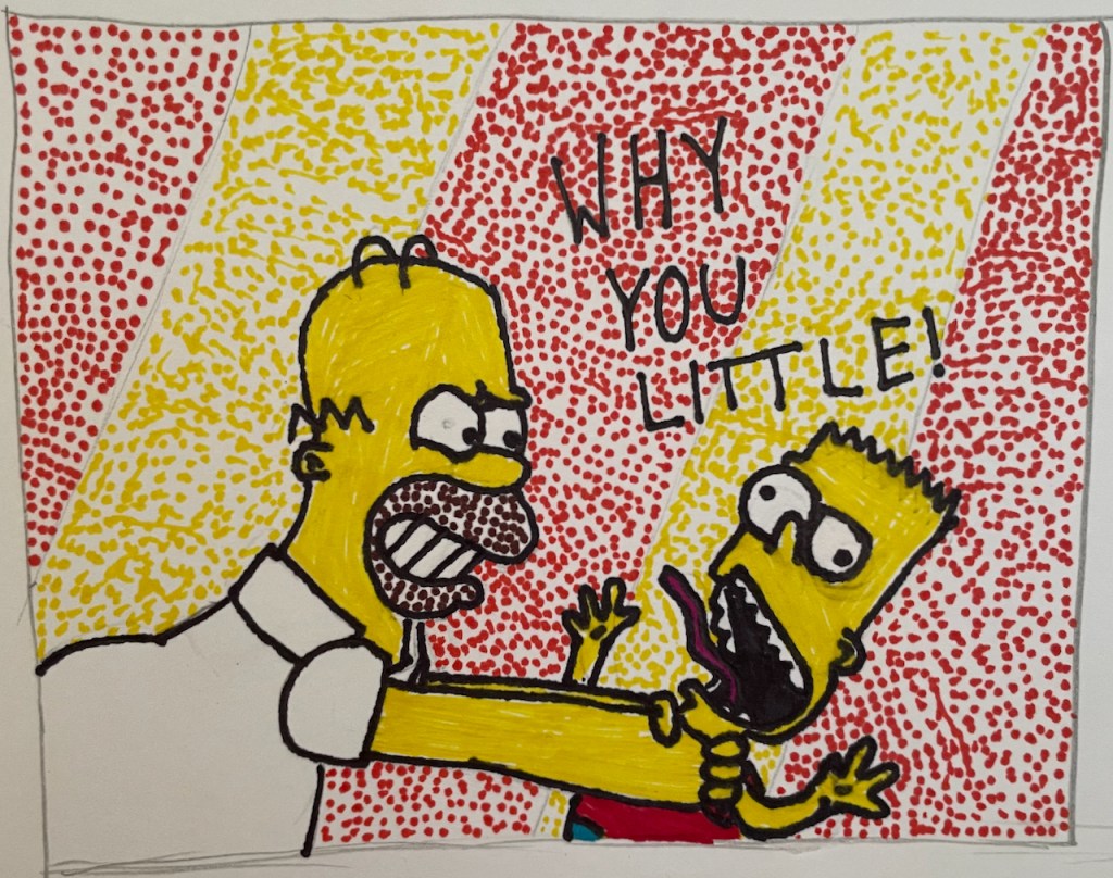 Art is alive and well–even in home school! Zoe’s inspiration was clearly The Simpsons, and this art is an example of Ben Day dots style, which she learned in art class! Seems like it’s been forever since my last post. Let’s start with another trench (art).