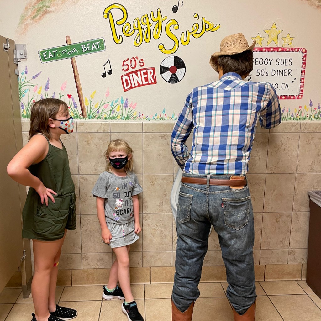 I must admit, when I wasn’t cringing (we arrived and headed to a pool filled with drunk college age humans where NO ONE was wearing a mask), we had a lovely time. And it was great to NOT be stuck in our own home together for a few days. Oh, and we drove out vs. flying. On the way, we stopped at Peggy Sue’s diner, a throwback restaurant filled with memorabilia from the 1950’s, where the ladies restroom looked like this:
