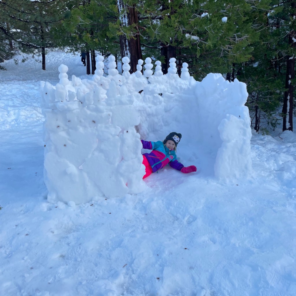 We found a spot that our friends had been to before, where there were inclines for sledding and space for snow building. In fact, someone before us has crafted a snow castle, which Ella really loved.