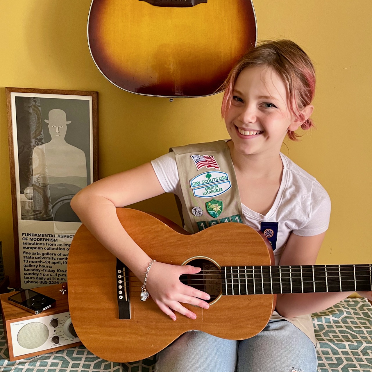 However, when we came inside to listen to the video we had recorded, there was a car alarm in the distant background and enough wind to make her hard to understand… So we headed to the back room (aka my office), which has guitars on the wall, a perfect place for a Girl Scout (GS) offering a “Special Thanks” song for January orders. Yes, we did that – and it was so much fun! First, here’s her video announcing sales and offering the song: