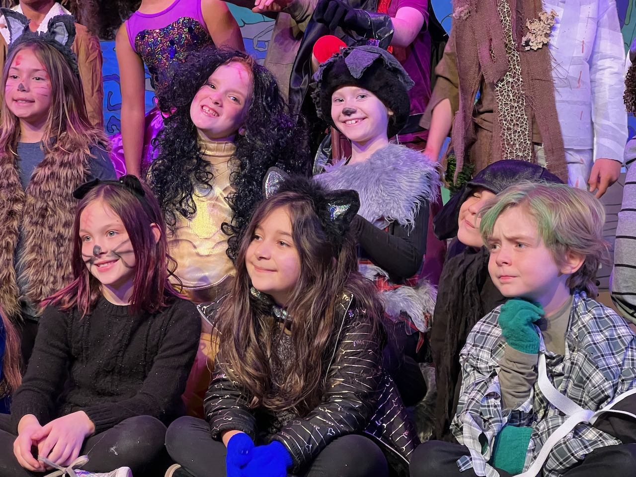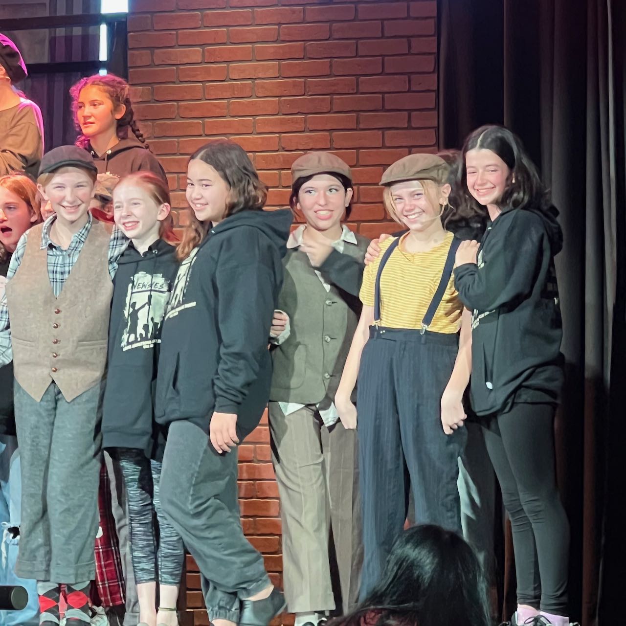 And that leads us to November (we’re almost done!), which kicked off with Zoe’s first official time on stage with her musical theater group. Once they get in the program, they have to audition for specific parts for two plays per school year, Fall and Summer. This Fall they put on a production of Newsies, which started as a Disney film (with Christian Bale) and led to a Broadway production, the version Zoe’s group put on. She was cast as “Mush“, one of the newsies, and had several lines, in addition to both song and dance performances. Here’s a shot from the end of her last show – pretty sure she had a blast: