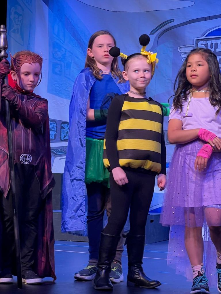 Not to be outdone, little miss Ella was in a show of her own through Drama Maniacs, an after school program where the kids get to help write the show itself. The theme was Super School, where the kids were superheroes–and one of them was a rotten tomato (that’s a spoiler)–attending a school for super kids. They wrote the script, with guidance, and got to decide their own character and super power. Ella decided to be a BEE.