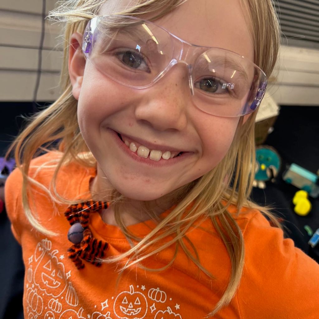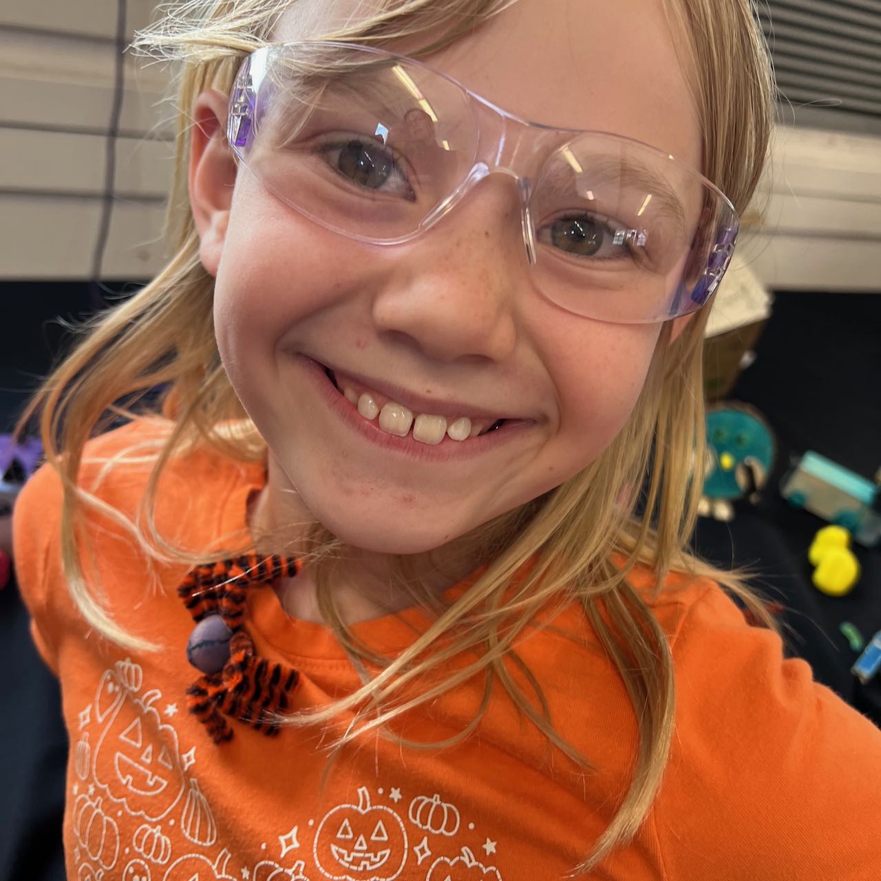 While they didn’t (obviously) get to use any dangerous woodworking tools, they did get to learn how toys are made, paint their own, and hawk their wares to all the parents on the final day at their “Toy Store”. Here’s Ella wearing her spider pin, more like jewelry than a toy, but handmade: