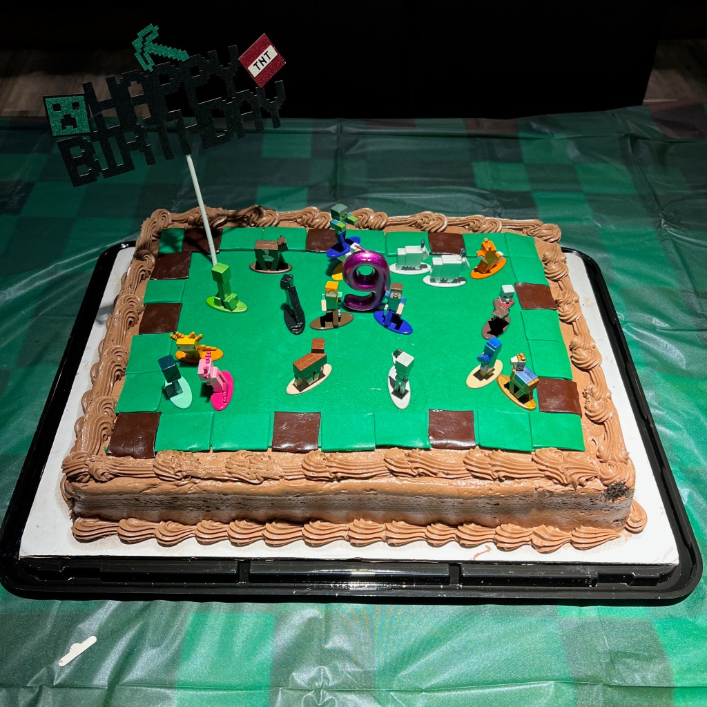 Before you ask, Bart did NOT make that cake. BUT he did buy a huge chocolate sheet cake from Costco (recommend) and decorated the top in Minecraft green and brown blocks, adding in some Minecraft figures to boot. Ella loved it (and it was delicious). Here’s a close-up: