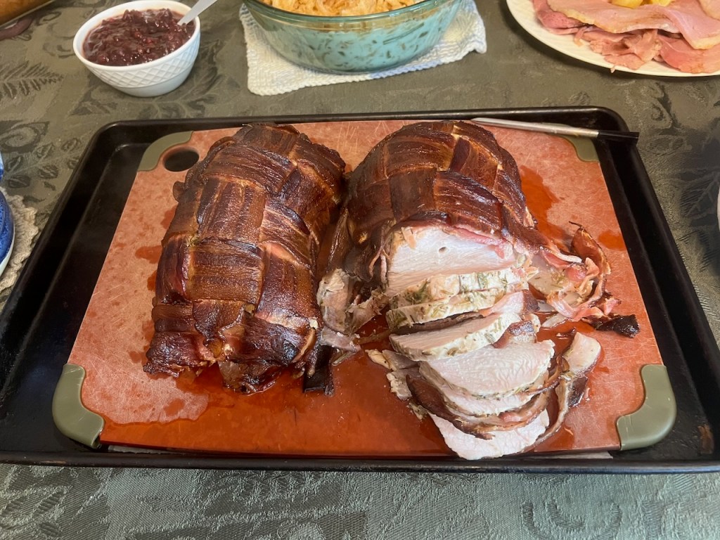 That night we went to yet another opening night animated movie: WISH! My mom called it her favorite Disney movie ever, though I’m not sure how often she’s watching Disney movies lately (other than when she’s with us!) Our last day in GA was Turkey Day, which we hosted at my sister’s house, and oddly took few pictures of the accomplishment. More cooking, less snapping. Though you can’t argue that this bacon-wrapped turkey my brother-in-law smoked doesn’t look incredible:
