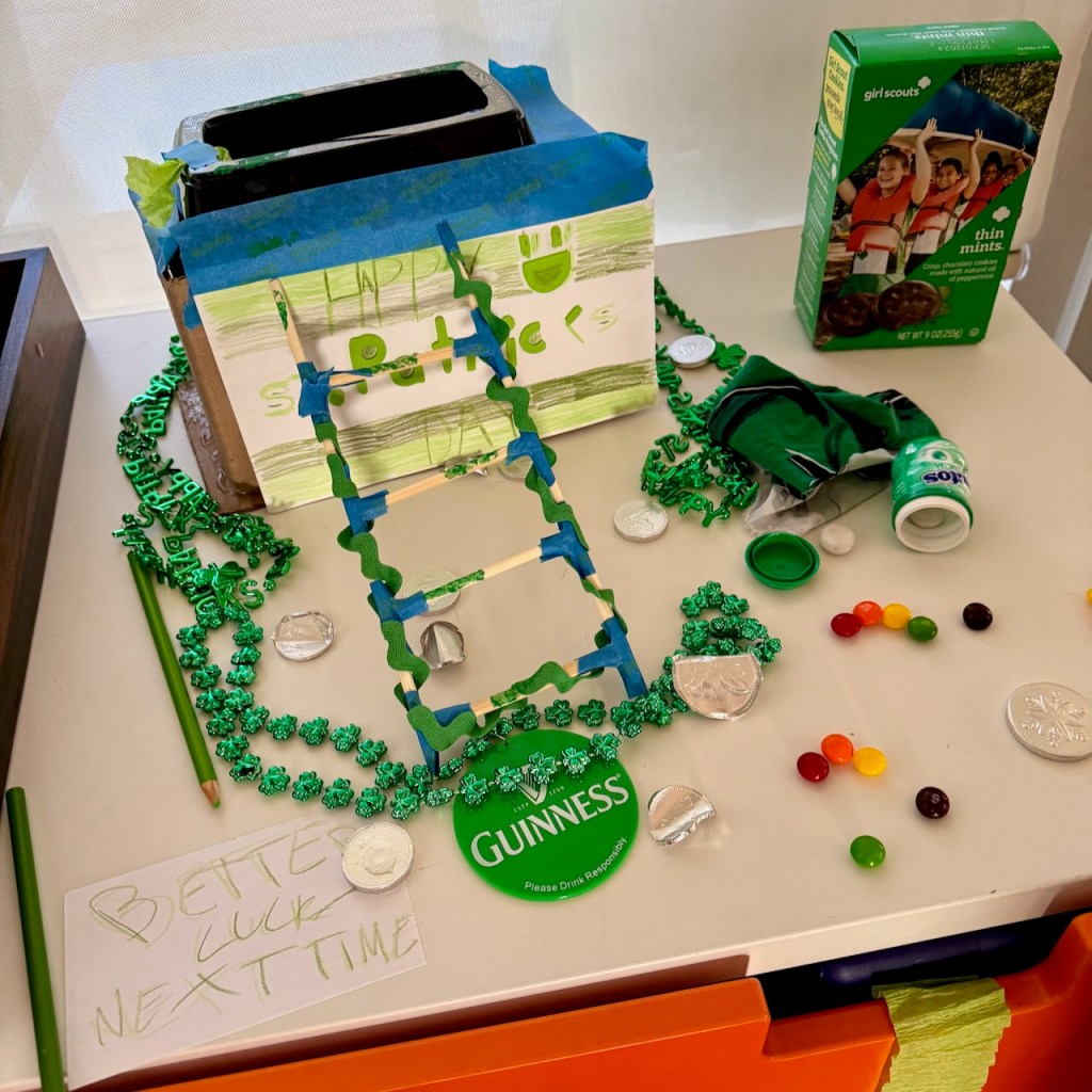 St. Patrick’s Day also happened! Complete with a leprechaun trap made by Ella, which sadly failed to capture an actual leprechaun, though he did mess up the place and leave a nasty note: