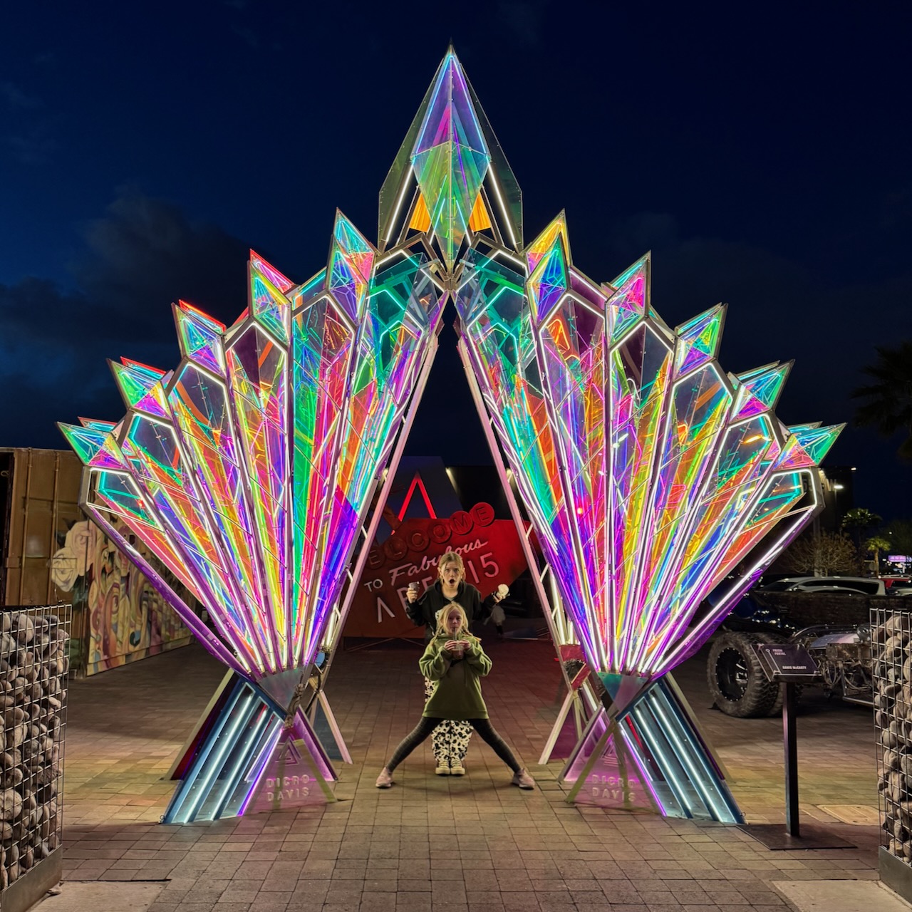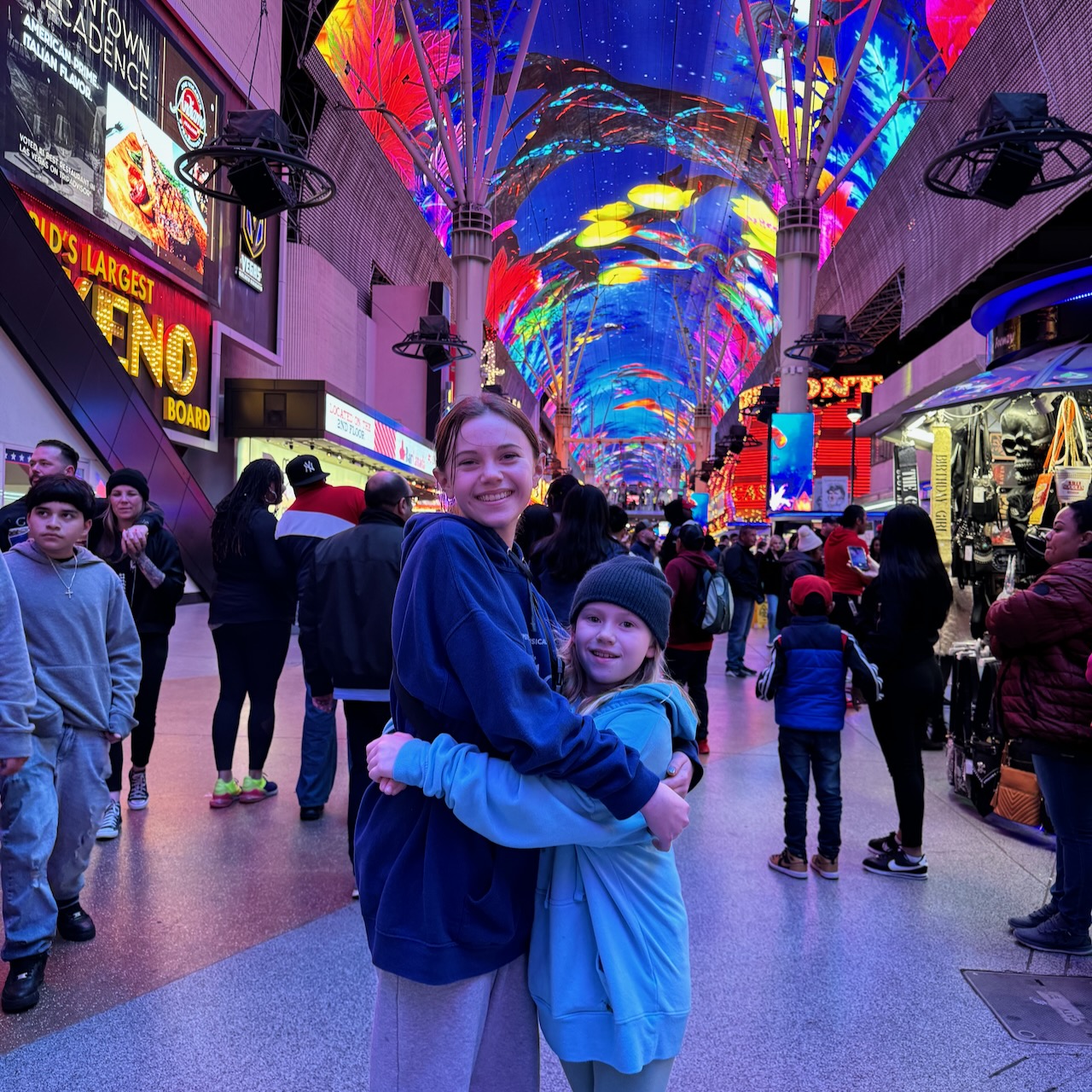 One questionable choice we made was taking the girls to The Fremont Experience at night… In an attempt to revitalize the downtown Las Vegas area, they blocked off three city streets, covering those streets with “the largest LED canopy display in the world“. There’s a zip line running down the middle, lots of kiosks with souvenirs, and more exposed body parts than I’ve seen in a very long time. I won’t include the picture here, but do you know what happens when you add an “s” at the end of Vegas? Ask the girl who had that written on her butt in red makeup.