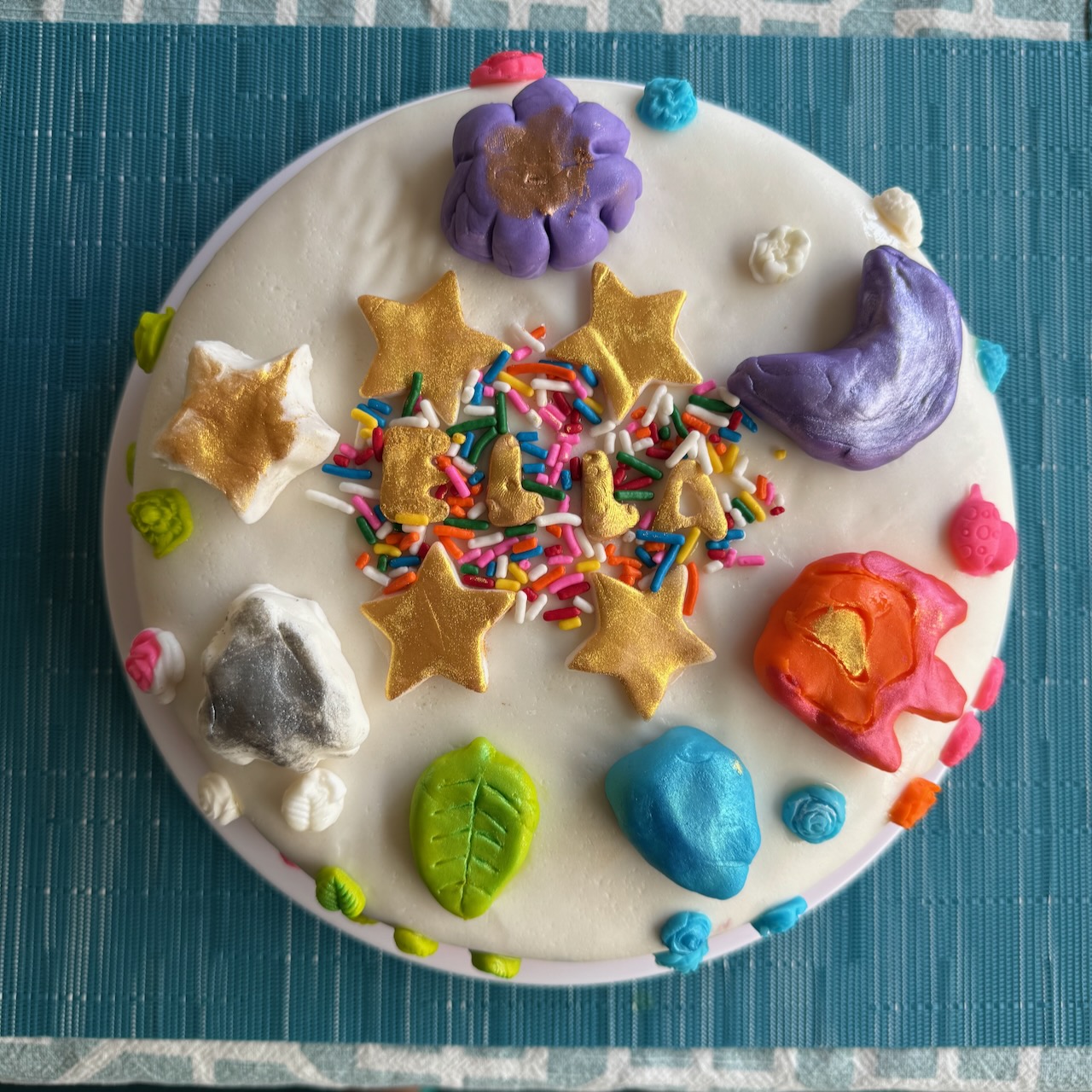 You may also be thinking, “But hey, doesn’t Bart make the girls a homemade cake every year?!” Yes, yes he does. This year, proving wisdom really can come with age, he baked the cake and bought the fondant, which both our kids love to touch and eat, and let them design their own. Note the carefully crafted “elements” for the Fire Team on top: