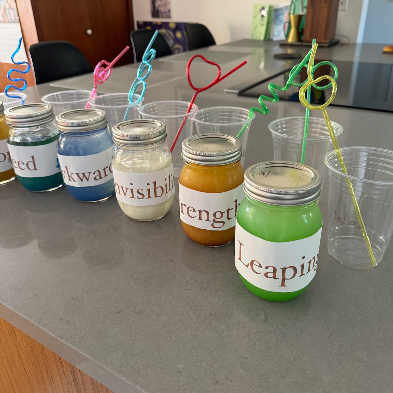 | Make own potion: Invisibility (apple juice), Night Vision (tea), Strength (milk), Speed (lemonade), Leaping (orange juice), Awkward (water) |