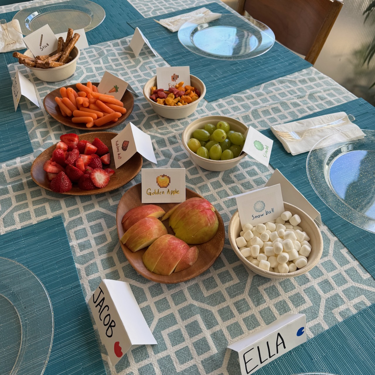 | Minecraft Snack mix: Red stone (strawberries), Slime balls (green grapes), Fish (goldfish), Carrots (carrots), Sticks (pretzel sticks), Snowballs (marshmallows), Golden Apples (small apples) |