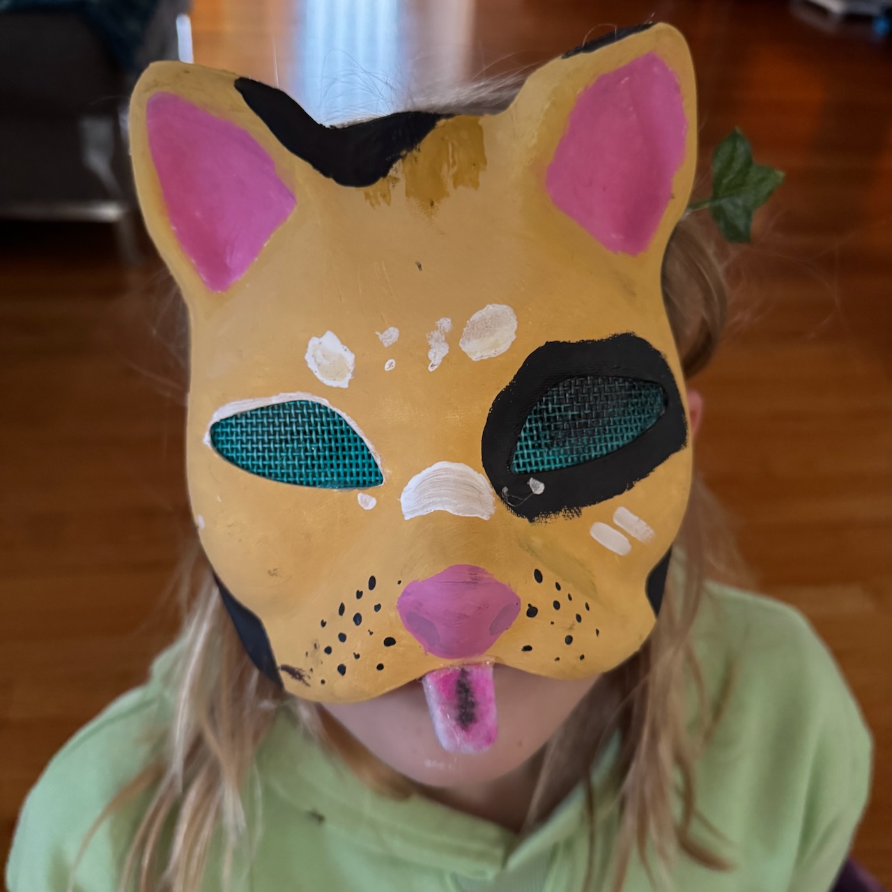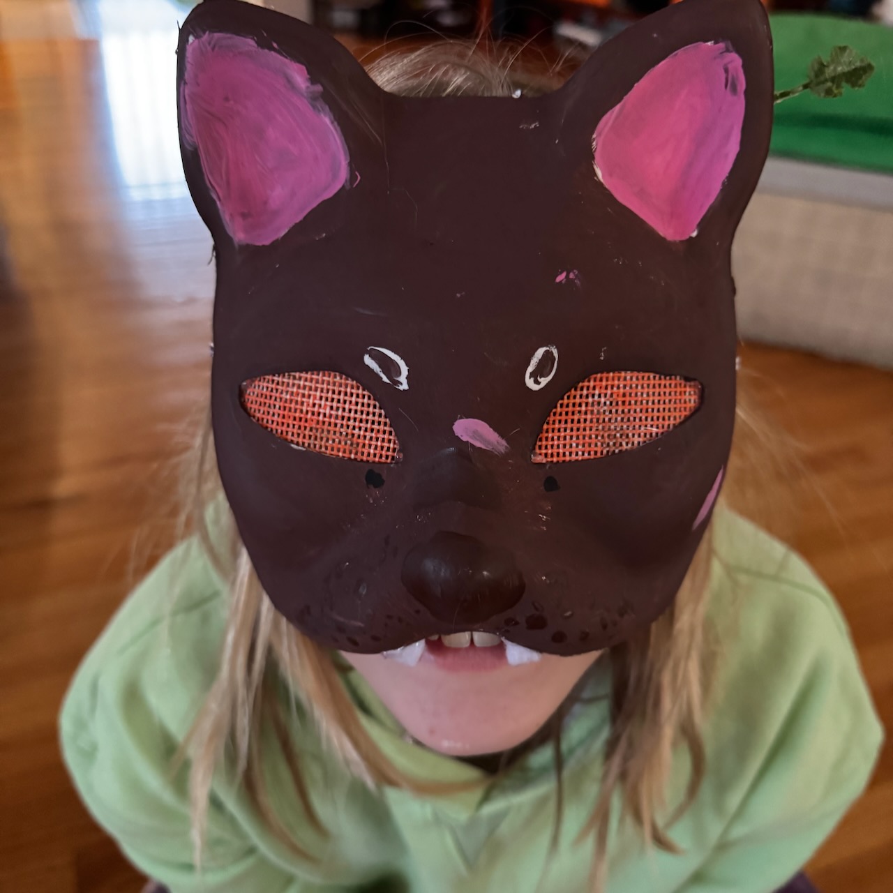 Being a Therian offers a lot of space for creativity and hands-on art skills. She has made 10 masks so far, all with different looks (mostly cats, one “wolf), which requires using felt, paint, mesh, accessories (including ivy and sparkly accoutrement) to decorate a pre-fabricated face mask that covers the top half of your face. The world is your oyster when it comes to decorations, and she’s even drawn on top of a mask she designed to create a new look. She’s added bigger ears, used all sorts of colors, and even learned the cat type she’s drawing. I do not hate the LEARNING aspect of this.